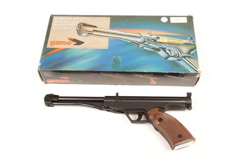 A BOXED .177 UNDER-LEVER AIR-PISTOL SIGNED GAMO, MODEL 'CENTER', serial no. 0319797, with 7 1/4in. barrel, flip-out breech, blued air-chamber, black crackle finish frame and adjustable brown plastic target right-hand grip, complete with its makers polystyrene carton and its original oil, cleaning rod, pellet sample, the whole appearing very little used