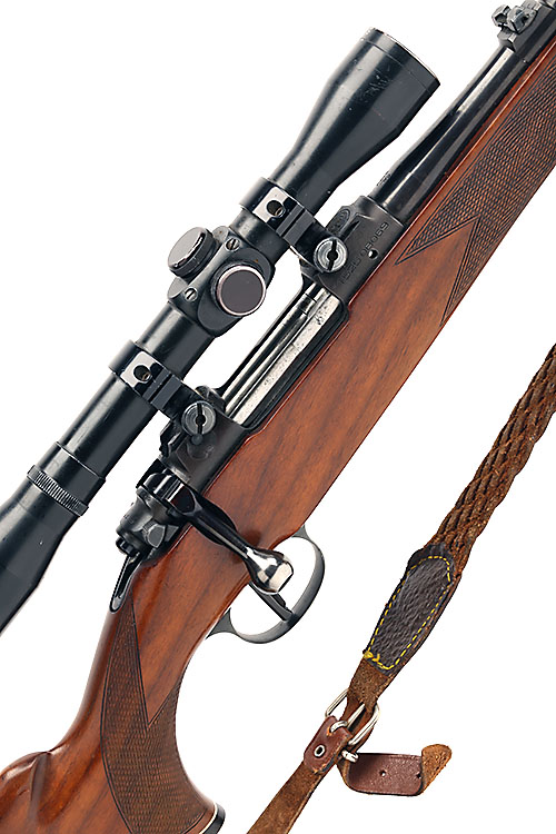 BRNO .243 W BOLT-MAGAZINE SPORTING RIFLE, serial no. 7152508069, 23 3/4in. nitro barrel, ramp-mounted fore-sight (bead missing), fitted with a Pecar 4x81 telescopic sight, manual safety, hinged floorplate, 14 1/2in. pistolgrip stock (including recoil pad) with cheekpiece, leather sling