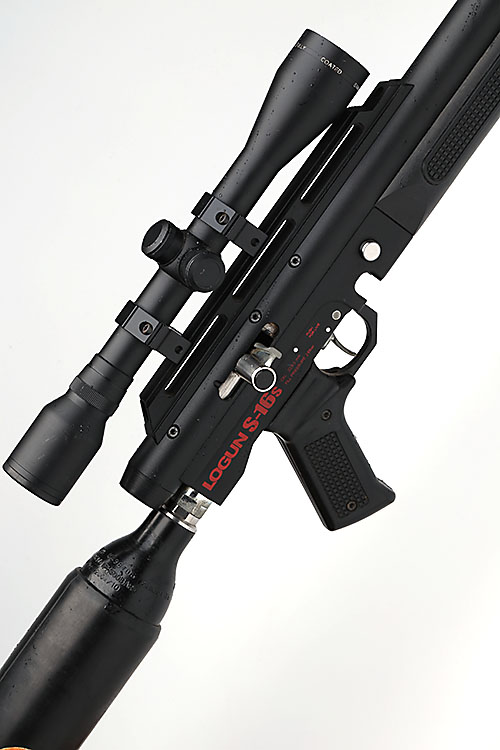 A .22 PRE-CHARGED PNEUMATIC AIR-RIFLE SIGNED LOGUN, MODEL 'SWEET-16', serial no. 18487, with 20in. barrel including moderator, blacked receiver, air-reservoir forming the butt and black plastic pistol-grip and fore-end, untested