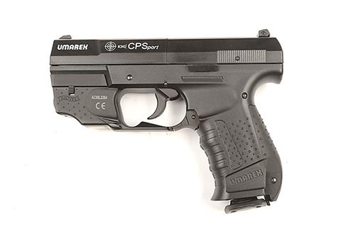 A CASED .177 CO2-POWERED AIR-PISTOL SIGNED UMAREX, MODEL 'WALTHER CPS', serial no. J074297521, in imitation of the firearm of the same name, with dedicated under-slung laser-sight, appearing little used in its abs case with pellets (untested, no magazine)