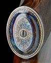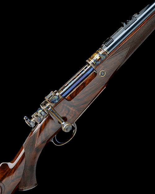23 3/4in. nitro barrel, gold-inlaid '- MANUFACTUR T. JUNG. LOHMAR - ', and two gold lines at the breech end, finely matted and gold-highlighted sight rib with open sights and two folding leaf sights, with gold-inlaid sight lines and marked for 50, 100 and 200 metres, finely matted and gold-highlighted ramp-mounted bead fore-sight with fold-over moonsight, quickly-detachable telescopic sight mount bases, solid side wall, the bolt mounted with an adjustable peep sight, the bolt handle with gold line detailing and progressive radial cut chequering, florally engraved recoil blocks with gold line detailing, hinged straddle floorplate with push button release, profusely engraved with acanthus scrollwork overall and retaining virtually full original colour-hardened finish, the receiver ring gold-inlaid 'EDITION NR.4 JAGEN WELTWEIT CAL. 404 JEFFERY', well-figured pistolgrip stock with colour-hardened and engraved steel pistolgrip-cap, 14 5/8in. pull including 5/8in. leather covered recoil pad, weight 9lb. 9oz.