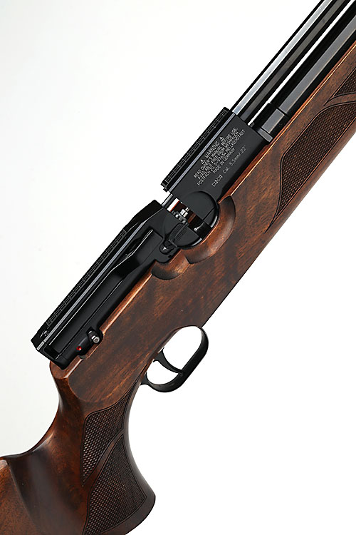 AN FAC-RATED .22 PRE-CHARGED PNEUMATIC AIR-RIFLE SIGNED WEIHRAUCH, MODEL 'HW100-S', serial no. 1912001, with 31in. barrel including sound-moderator, lever operated receiver with aperture for magazine (missing), detachable quick-fill air reservoir with gauge and walnut sporter stock