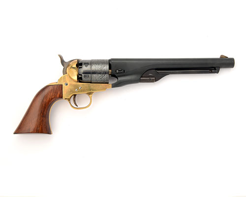 A REPRODUCTION .44 PERCUSSION REVOLVER SIGNED PIETTA, MODEL '1860 REBEL ARMY', serial no. 522015, with blacked 8in barrel, blued roll engraved cylinder, open brass frame and grip-straps, smooth walnut grip