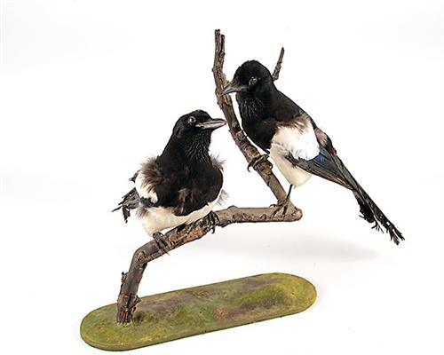 A PAIR OF FULL-MOUNTS OF MAGPIES, mounted on a wooden branch. tail slightly damaged.