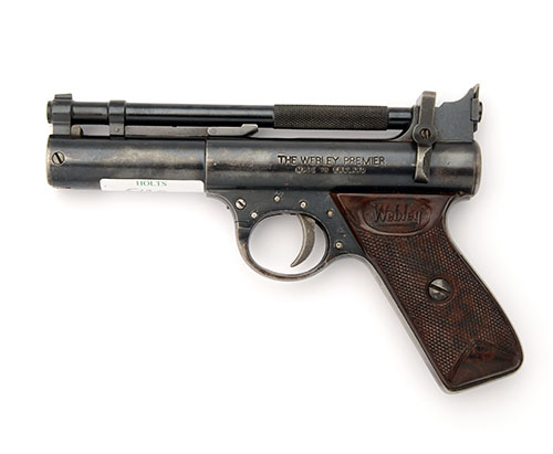 A .22 BARREL COCKING AIR-PISTOL SIGNED WEBLEY & SCOTT, MODEL 'PREMIER 'E' SERIES', batch no. 92, with blued 6 1/2in. barrel, blued stepped air-chamber, five pin trigger unit and brown chequered bakelite grips