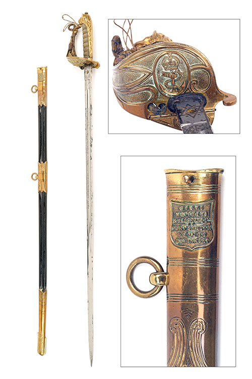 circa World War One, with slightly curved Wilkinson type 31 1/2in. blade etched for the majority of its length with arabesque panels of scrolls, the centre of the right hand side with a Royal Crest, the left with a fouled anchor surmounted with a King's crown (some minor stains), the forte with 'BY APPOINTMENT' together with 'GIEVE MATTHEWS & SEAGROVE LTD, PORTSMOUTH, LONDON & DEVONPORT, the back edge with the number '2', gilded brass gothic half-basket hilt with moulded King's crown and fouled anchor device, the pommel carved with a lions head, white wire-bound sharkskin grip and fold-down inner guard, together with its brass mounted black leather scabbard, the throat with an embossed shield bearing the makers details, and remnants of a bullion sword knot.
