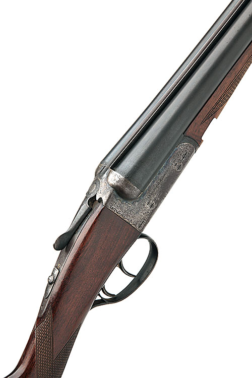 28in. nitro barrels, 2 3/4in. chambers, bored approx. 1/2 and full choke, automatic safety, removable striker discs, zig-zag bordering, retaining traces of original colour hardening and finish, 14 3/4in. stock;