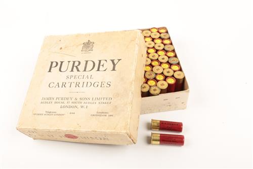 ONE HUNDRED ROUNDS OF VINTAGE AND COLLECTABLE 12 BORE 2 1/2 INCH SHOTGUN AMMUNITION BY PURDEY having No 7 shot with salmon/ red paper bodies and dep case heads in factory box with James Purdey & Sons Audley House address and named on the lid side with applied printing to a Col, GRD H with insect damage to one side of the lid.