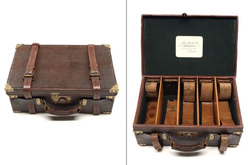 A BRASS-BOUND PIGSKIN CARTRIDGE MAGAZINE,