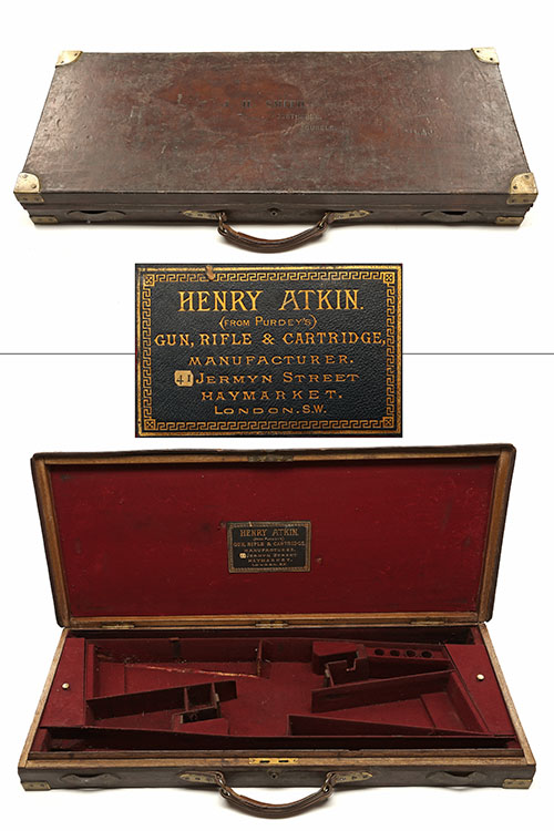 fitted for 30in. barrels, the interior lined with red baize, a leather gold-tooled Henry Atkin trade label, central brass push-button lock (key missing), the lid exterior embossed with 'J.H. SMITH, COBTHORNE, OUNDLE'