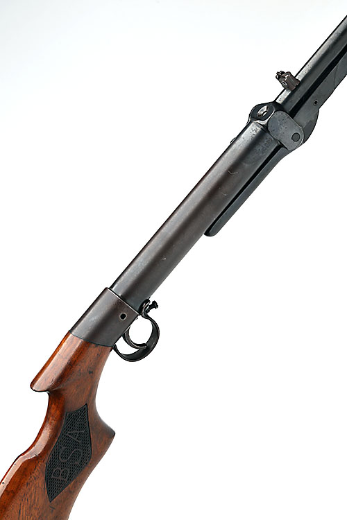 A .177 UNDER-LEVER AIR-RIFLE SIGNED BSA, MODEL 'LADIES OR LIGHT PATTERN STANDARD', serial no. L38994, for 1932, with 17in. sighted barrel, plain air-chamber (no trace of etching) and walnut saw-handled butt-stock and push-button under-lever