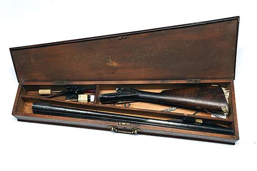 THE MAJOR PARTS OF THE STOCK, ACTION AND FORE-END ONLY OF A WILLIAM POWELL 12-BORE LIFT-UP TOPLEVER BAR-IN-WOOD HAMMERGUN, n.v.s.n., barrels originally marked 10175, in a wooden box