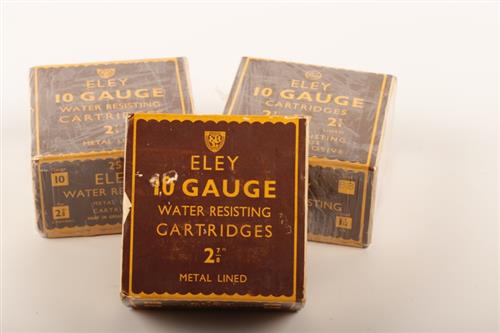 SEVENTY FOUR VINTAGE AND COLLECTABLE 10 BORE 2 7/8 INCH PAPER CASED SHOTGUN CARTRIDGES BY ELEY in 3 factory boxes 2 listing 1 7/16 oz of No4 shot & 1 the use of BB but also containing cartridges with No5 overcards