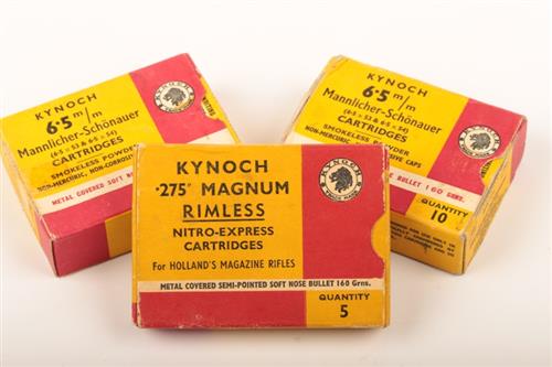 TWENTY FIVE ROUNDS OF VINTAGE KYNOCH SPORTING RIFLE AMMUNITION COMPRISING 20 ROUNDS OF 6.5 M/S & 5 ROUNDS OF .275 MAGNUM RIMLESS all in their factory boxes listing all bullets as 160 grain soft nose.