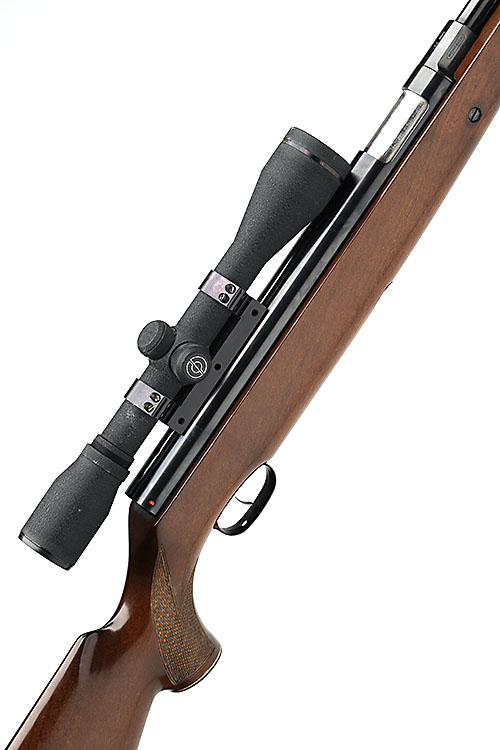 A .22 UNDER-LEVER AIR-RIFLE SIGNED WEIHRAUCH, MODEL HW77, serial no. 1179195, with blued 18in. barrel, sliding breech, air-chamber with safety catch, beech half-stock, complete with a SIMMONS WHITETAIL CLASSIC 4x40 telescopic sight