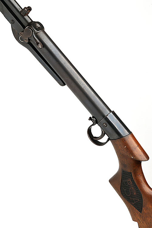 A .177 UNDER-LEVER AIR-RIFLE SIGNED BSA, MODEL 'LADIES OR LIGHT PATTERN, serial no. L40168, for 1935, with blued and sighted 17in. barrel, tap load at breech, plain air-chamber (no visible etching), saw-handled walnut butt-stock and push button under-lever, much finish remaining, possibly renewed