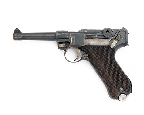 dated for 1937, with 4in. barrel, blade fore-sight, sighting notch to the rear of the hinged toggle, the top marked 'S/42', blued receiver, blued frame, chequered walnut grips and aluminium based magazine, all matching numbers except magazine