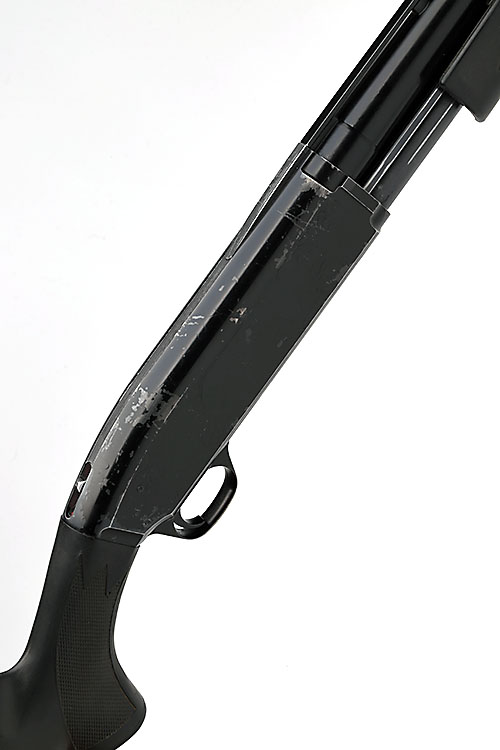 BROWNING 10-BORE (89mm) PUMP-ACTION SHOTGUN, serial no. 16383NVT192, restricted magazine, 30in. nitro barrel with raised ventilated 7mm rib, 89mm chamber, multichoke, top-tang safety, action with acanthus scroll engraving surrounding vignettes of fowl, 14 1/4in. synthetic pistolgrip stock including 3/4in. rubber recoil pad, the whole with blacked finish, weight 10lb. 7oz.