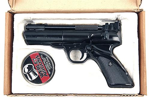 A BOXED .177 BARREL-COCKING AIR-PISTOL SIGNED WEBLEY & SCOTT, MODEL 'TEMPEST', no visible serial number, with blued 6 3/4in. barrel, black enamelled air-chamber with plastic furniture and grips, in its maker's card carton