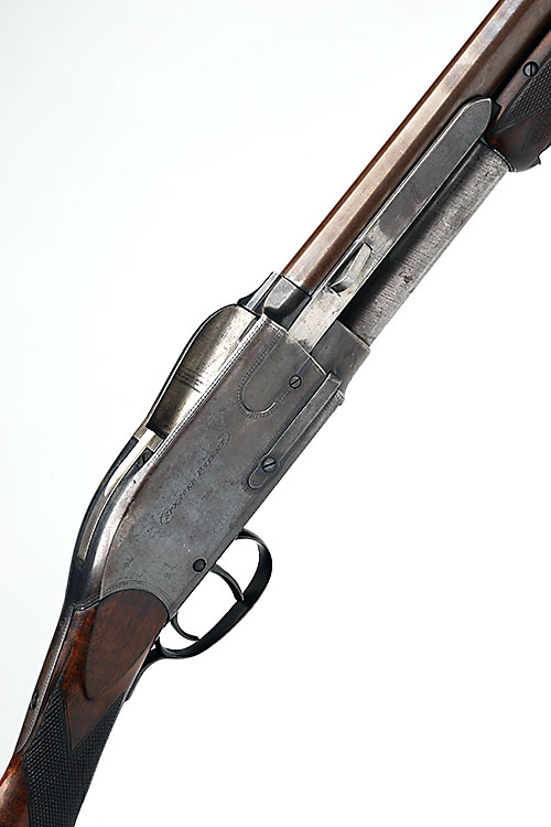 SPENCER ARMS CO. 12-BORE 1882 PATENT 12-BORE REPEATING SHOTGUN, RETAILED BY CHARLES LANCASTER, serial no. 1233 / 5563, 30in. black powder only damascus barrel (some pitting), bead fore-sight, 2 1/2in. chamber, bored approx. 3/4 choke, Spencer & Roper patent action, US patent no. 255,894 / UK patent no. 1636 of 1882, with pivoted breech block, damascus tubular magazine (restricted) with exterior sliding handle which operates loading and ejecting cartridges and cocks the hammer, the triggerguard housing a secondary reversed trigger which also cocks the hammer, action engraved 'CHARLES LANCASTER. 151. NEW BOND STREET. LONDON.', 'SPENCER PATENT', and with beaded border engraving, retaining some original colour-hardening and finish, 13 1/2in. stock
