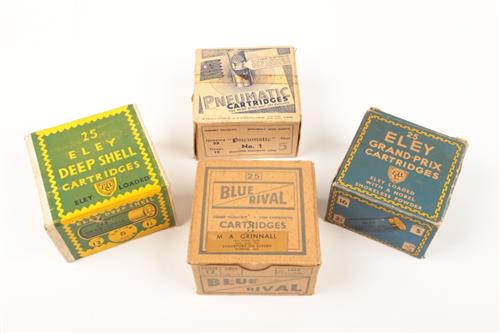 ONE HUNDRED VINTAGE AND COLLECTABLE PAPER CASED SHOTGUN CARTRIDGES IN THEIR VINTAGE FACTORY BOXES OF 25 comprising Pneumatic No1, Blue Rival, Eley Deep Shell & Eley GP (in 16 bore) all others being in 12 bore.