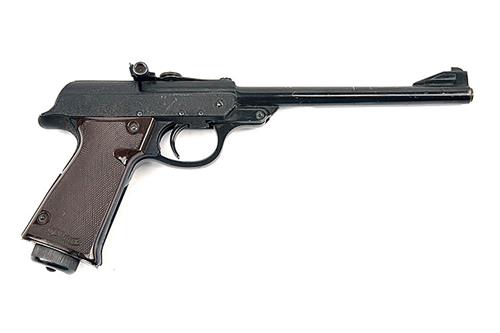 early type with 9 1/4in. blacked barrel, black crackle-finished receiver and brown chequered plastic grips, complete with wood cocking aid