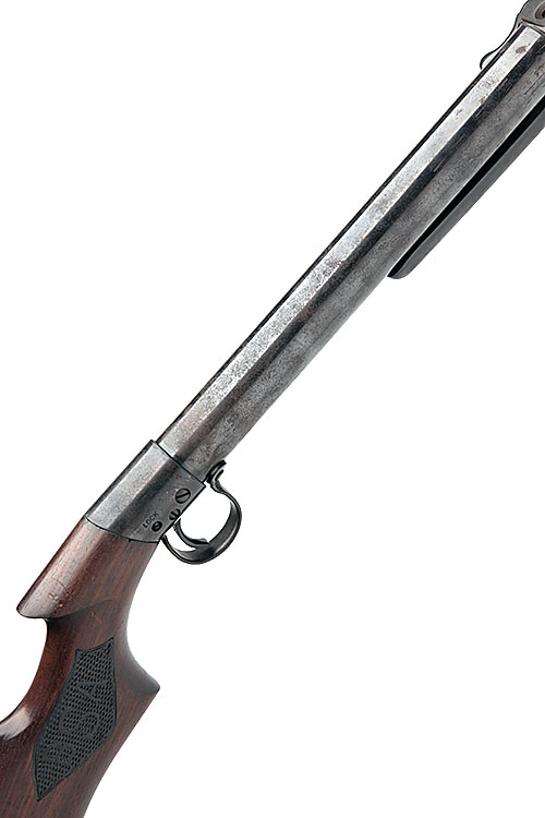 for 1938, with sighted 19 1/4in. barrel, plain air-chamber, saw-handled walnut butt and push-button under-lever