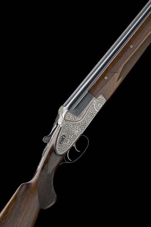 27 5/8in. (70cm) nitro reproved barrels (in 2017) with 8mm solid matt top-rib, 2 3/4in. chambers, bored approx. 3/4 and full choke, three-piece fore-end with wooden side fillets, bolstered action, manual safety, hand-detachable lockplates, cocking-indicators, articulated front trigger, bold Germanic scroll engraving, bright and blued finish, 15 1/8in. pistolgrip stock with cheekpiece, pistolgrip-cap, sling swivels and including 7/8in. ventilated rubber recoil pad, weight 7lb. 3oz.