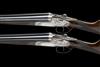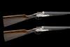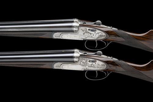 28in. nitro reproved chopperlump barrels, ribs engraved 'JOHN POWELL. GUNMAKER. REIGATE.', and gold-inlaid '1' and '2' at the breech ends, 2 3/4in. chambers, bored approx. 1/4 and 3/4 choke (No.1) and 3/4 and full choke (No.2), No.2 wall thicknesses below recommended minimum, Spanish made by Grulla, treble-grip actions with hidden third bites and removable striker discs, toplevers gold-inlaid '1' and '2', automatic safeties with gold-inlaid 'SAFE' details, hand-detachable lockplates, gold-inlaid cocking-indicators, articulated front triggers, rolled-edge triggerguards, fine floral and acanthus scroll engraving, the lockplates gold-inlaid in script 'John Powell' and finely engraved with game scenes of pheasant and duck (No.1) and partridge and woodcock (No.2), signed 'K. THOMAS', the undersides with vignettes of wildfowl, bright and blued finish overall, 15in. boldly-figured stocks, weight 6lb. (No.1) and 5lb. 11oz. (No.2), in a brass-cornered leather case with John Powell (Reigate) trade label