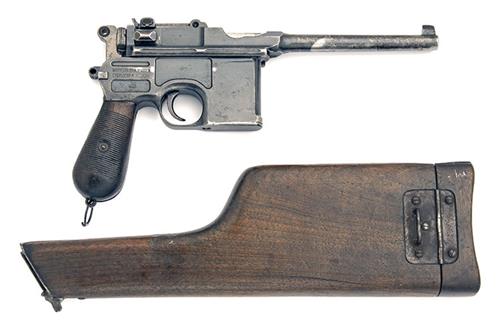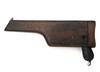 for between 1911-15, with 5 1/2in. sighted barrel, polished bolt with short extractor, 1000 metre graduated back-sight, milled sides to receiver and frame, integral magazine and 32 groove walnut bag-shaped grips, fair amount of original finish, complete with its matching number holster-stock (hairline cracks to all sides)