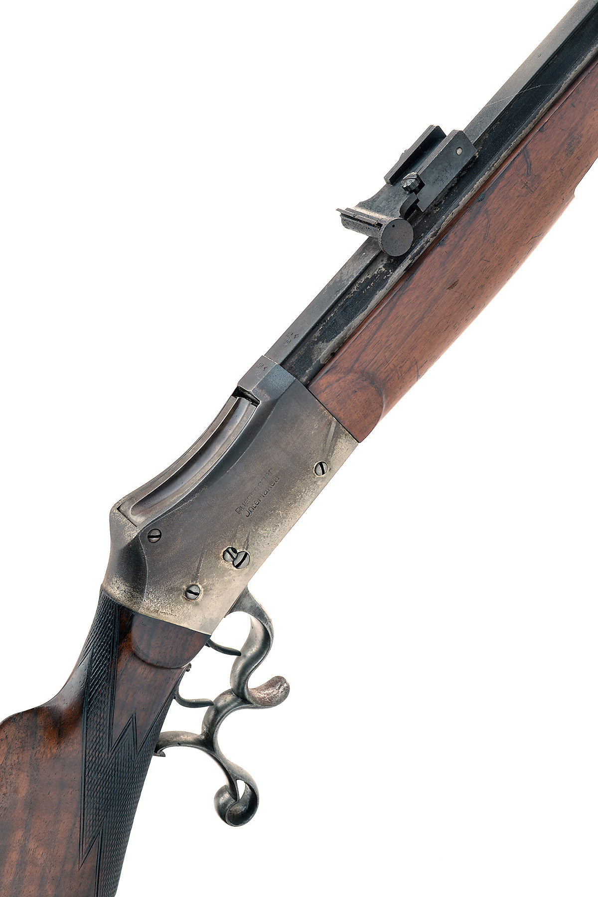 with heavy octagonal 32in. barrel, adjustable sights, plain action signed ' RUEGSEGGER INTERLAKEN', no provision for peep-sight at wrist, Swiss style walnut butt with raised cheek-piece and adjustable hooked heel-plate, complex trigger-guard forming the under-lever, double set triggers and walnut fore-end