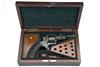 circa 1865, with 2 3/4in. octagonal barrel, the top-strap signed 'ADKIN, BEDFORD', borderline engraved plain front-locking cylinder, borderline engraved frame, lift-up hinged loading gate, one-piece chequered walnut grip, iron butt-cap, articulated rammer mounted to right hand side of barrel and sheathed single action trigger, re-finished, together with a slightly later mahogany case adapted for this revolver, re-lined in green velvet and complete with a turnscrew, the lid with rectangular brass escutcheon engraved 'PRESENTED TO GEORGE LOGAN BY THE FOREMAN AND OFFICE STAFF OF GREENOCK CABINETMAKING CO, 4TH OCTOBER 1894'