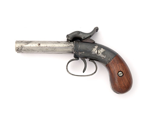 A .36 PERCUSSION DOUBLE-BARRELLED SINGLE-TRIGGER DERRINGER PISTOL, serial no. 374,