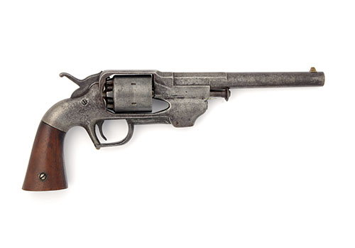 for 1861-62, with 7 1/2in. two-stage barrel (markings erased), plain cylinder, plain solid frame with frontal cylinder release and central hammer (number '1' on loading lever), smooth walnut grips, hinged rammer forming the trigger-guard, no finish, some staining and frosting