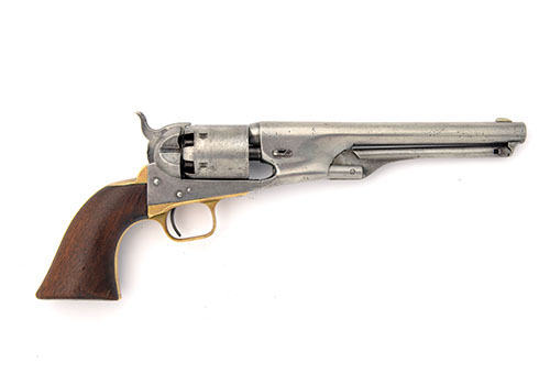 for the first year of manufacture, 1861, with round 7 1/2in. barrel, the top signed 'ADDRESS COL. SAML. COLT NEW-YORK U.S. AMERICA', cammed under-barrel loading lever, open iron frame, plain cylinder with traces of roll-engraved scene, brass grip-straps and trigger-guard bow, smooth walnut grips, almost completely stripped of finish