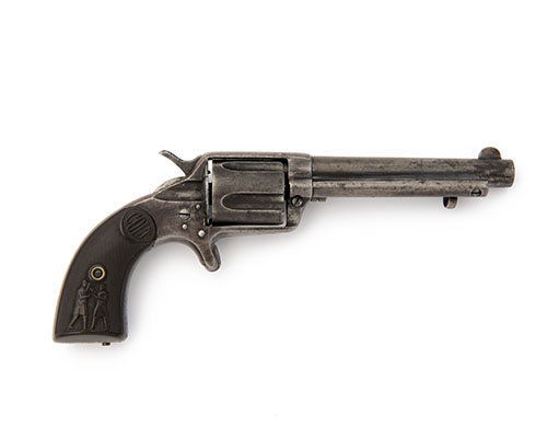 for 1885, with 4 1/2in. tapering barrel signed on two lines, the left hand side with traces of the etched model details, solid frame, fluted cylinder, chequered hard-rubber grips with raised depictions of a Policeman apprehending a villain, spur trigger, traces of finish only