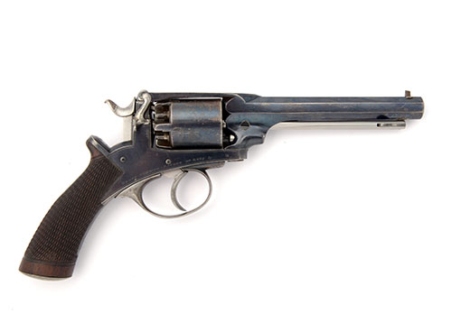 circa 1860, with octagonal 6in. barrel, borderline engraved top-strap signed 'DEANE & SON, LONDON BRIDGE', plain cylinder, two-part construction borderline engraved frame, spurred hammer, guarded trigger and chequered walnut grip with iron pommel-cap, the whole an older re-blue retaining much of that finish, brushed bright under-barrel loading lever with side-catch release