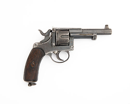 Warnant's patent circa 1872, with blacked octagonal 4 3/8in. barrel, blade fore-sight, standing notch rear-sight to the end of top-strap, fluted cylinder, solid frame with field-strippable side-plate, double action mechanism and coarsely chequered walnut grip with lanyard ring at heel