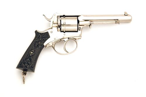probably French or Belgian circa 1880, with 4in. semi-octagonal barrel, dove-tailed block and bead fore-sight, standing notch rear-sight to end of top-strap, plain cylinder with external ratchet locking, solid frame with loading gate, fancy embossed gutta-percha grips, guarded trigger and pinfire style ejector rod, the whole retaining virtually all its original nickel-plated finish