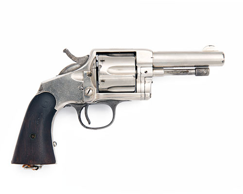 circa 1880, with round 3 7/8in. sighted barrel (possibly expertly shortened in antiquity), crescent fore-sight, sighting groove to the top-strap, the top-strap also marked 'HOPKINS & ALLEN MFG CO PAT MCH. 28. 71, MAY 27. 79' and 'XL No8 CAL WINCHESTER 1873', underbarrel swing-out ejector stored in the cylinder arbor, fluted cylinder, solid frame, colour-hardened hammer trigger and trigger-guard bow, smooth walnut grips (possibly slimmed) and lanyard ring at heel, the whole retaining much possibly original nickel-plated finish