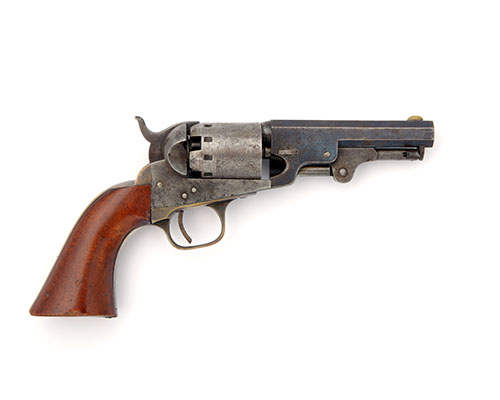 circa 1862, with blued octagonal 4in. barrel signed 'MANHATTAN FIRE ARMS CO. NEWARK N.J.' (much finish remaining), open iron 'Colt' type frame, plain cylinder with roll engraved decoration and ten locking notches, brass grip-straps and trigger-guard bow (traces of plating), smooth walnut grip and hinged under-barrel rammer