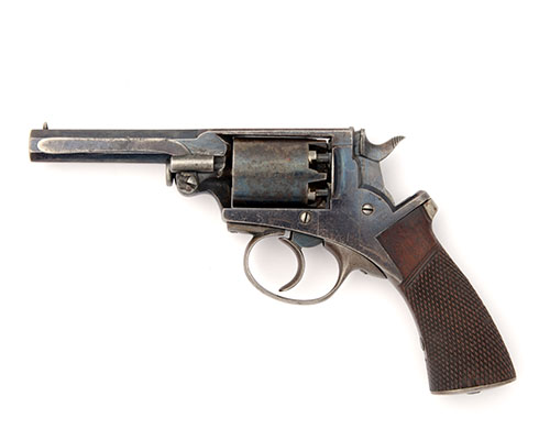 circa 1860 and a licenced copy of the Adams, with blued 3 1/4in. barrel, pillar fore-sight, standing notch rear-sight to rear of top-strap, plain five-shot cylinder, plain blued solid frame, spurred hammer, guarded trigger and chequered walnut grip (small loss to top edge), the barrel fitted with an articulated rammer, strong amount of original finish throughout