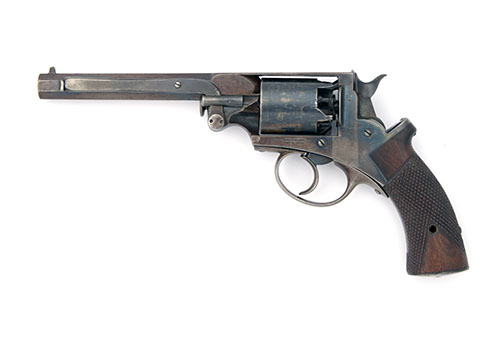 circa 1860 and a licenced copy of the Adams, with blued 6in. barrel, blade fore-sight, standing notch rear-sight, the top-strap signed 'MANUFACTURED BY MASS. ARMS CO, CHICOPEE FALLS', plain five-shot cylinder, plain blued solid frame, spurred hammer, guarded trigger and chequered walnut grip drilled with bossed lanyard loop-hole, the barrel fitted with an articulated rammer, traces of original finish throughout