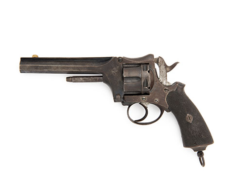 Belgian circa 1870, with 5 1/2in. semi octagonal barrel, the side of breech signed 'MEYERS BREVETE', raised sighting rib with applied nickel crescent fore-sight, removable stepped and fluted cylinder, the knock-out ejector rod mounted beneath the barrel, hinged frame, flared chequered walnut grips and guarded trigger, traces of blued finish