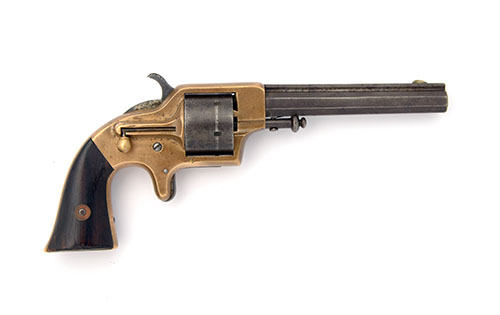 circa 1865 and originally supplied with an additional front-loading lip-fire cylinder, with octagonal 5 3/8in. barrel, raised sighting rib signed 'PLANT MFG CO NEW HAVEN CT', the left hand side marked 'MERWIN & BRAY NEW YORK', applied white-metal blade fore-sight, sighting-groove to the top-strap, solid bronze frame with central hammer and spur trigger, bolt-action ejector mounted to right of frame behind the plain iron cylinder and smooth walnut grips