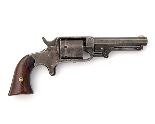 circa 1865, with 4in. octagonal barrel, solid frame, plain cylinder with threaded plugs bearing percussion nipples, hinged loading and ejecting rod beneath barrel, spur-trigger and smooth flared walnut grips, traces of finish