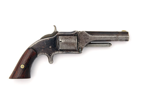 circa 1862, with octagonal 3 1/2in. tip-up barrel (locking catch spring missing), raised sighting rib signed 'SMITH & WESSON, SPRINGFIELD MASS.' above patent dates to 1859, applied crescent fore-sight, fixed ejector-pin beneath the barrel, no top-strap cylinder lock, plain cylinder, plain iron frame, central hammer and spur trigger, smooth flared walnut grips, traces of finish with some bruising