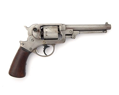 circa 1864, with round 6in. sighted barrel, dove-tailed blade fore-sight, plain cylinder, plain hinged frame, selectable trigger-blade (action slightly at fault), flared walnut smooth one-piece grip and articulated under-barrel loading lever, minimal traces of finish remaining