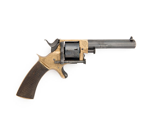 circa 1863 and almost certainly manufactured by William Tranter, with blued semi octagonal 4 1/4in. barrel, Birmingham proofs, dove-tailed fore-sight blade, standing notch rear-sight to rear of top-strap, engraved bronze frame (re-gilded in places), wingnut cylinder arbor release, plain re-blued cylinder, spur-trigger, chequered walnut grips, the ejector rod articulating on the front of frame and held in position by the closed loading gate