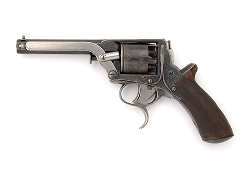 circa 1857, with re-blued 4 1/2in. barrel, scroll engraving at muzzle and barrel throat, the border engraved top-strap un-signed, dove-tailed fore-sight, standing notch rear-sight, scroll engraved plain cylinder with rope-twist engraved band to leading edge, border and scroll engraved solid frame with inverted 'Y' safety spring to left hand side, double action mechanism with spurless hammer, walnut chequered semi saw-handled grip (small chip to top-left) carved with a dog seated beneath a tree in lieu of an escutcheon and hinged 'Tranter's Patent' rammer on left of barrel, refinished throughout